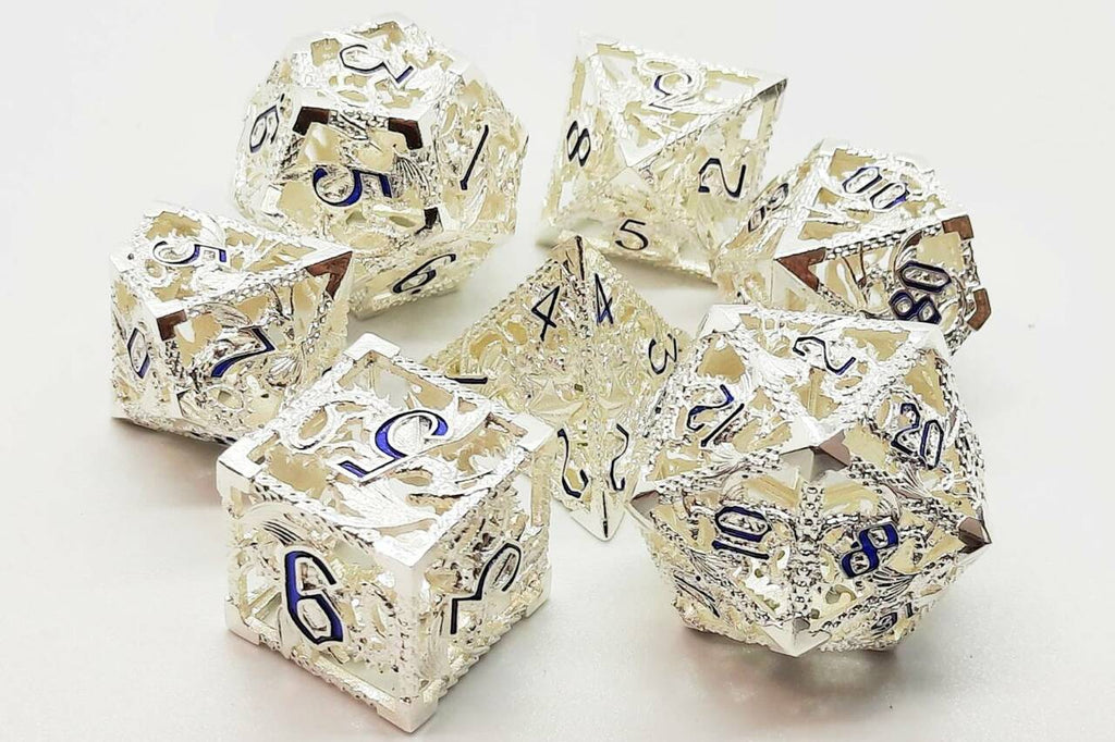 OSDMTL-78 Hollow Dice - Silver w/ Blue Polyhedral 7 Die Set