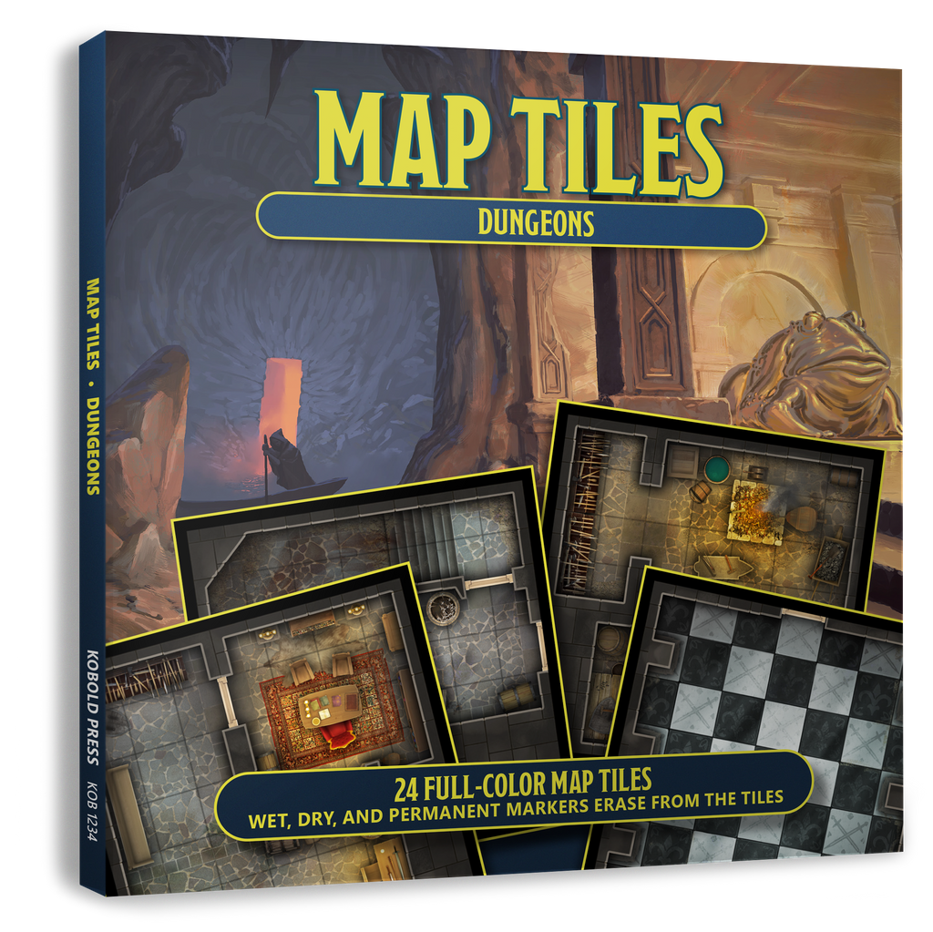 Instantly drop your players into a multitude of dungeon encounters and dangers with Map Tiles: Dungeons from Kobold Press! These 24 wet- and dry-erasable 7″×7″ tiles are beautifully illustrated with mysterious and terrifying locales suited for forgotten dungeons and underground fortresses, including dungeon gateways, treasure troves, crypts, eldritch shrines, and more!