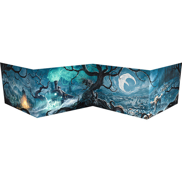 The Crooked Moon Game Master Screen & Maps set is an essential tool for GMs, featuring gorgeous full-color artwork of Wickermoor Hollow to face players and practical reference tables and helpful tips for running your adventure on the inside. This foldable screen helps guide players through a realm of perpetual twilight and looming terror. Shield your secrets, hide your monsters, and roll your dice behind this screen, as you conjure malevolent mysteries and immerse your table in the chilling ambiance of The Crooked Moon!